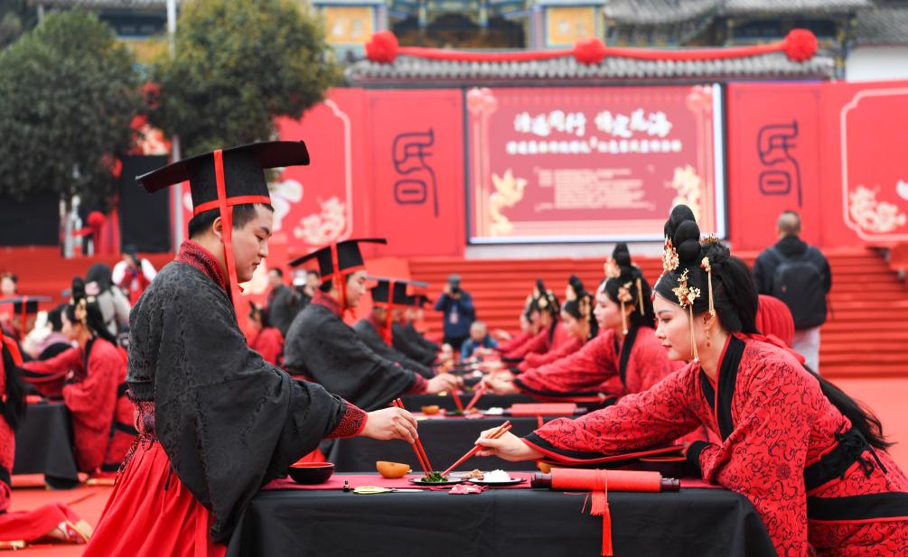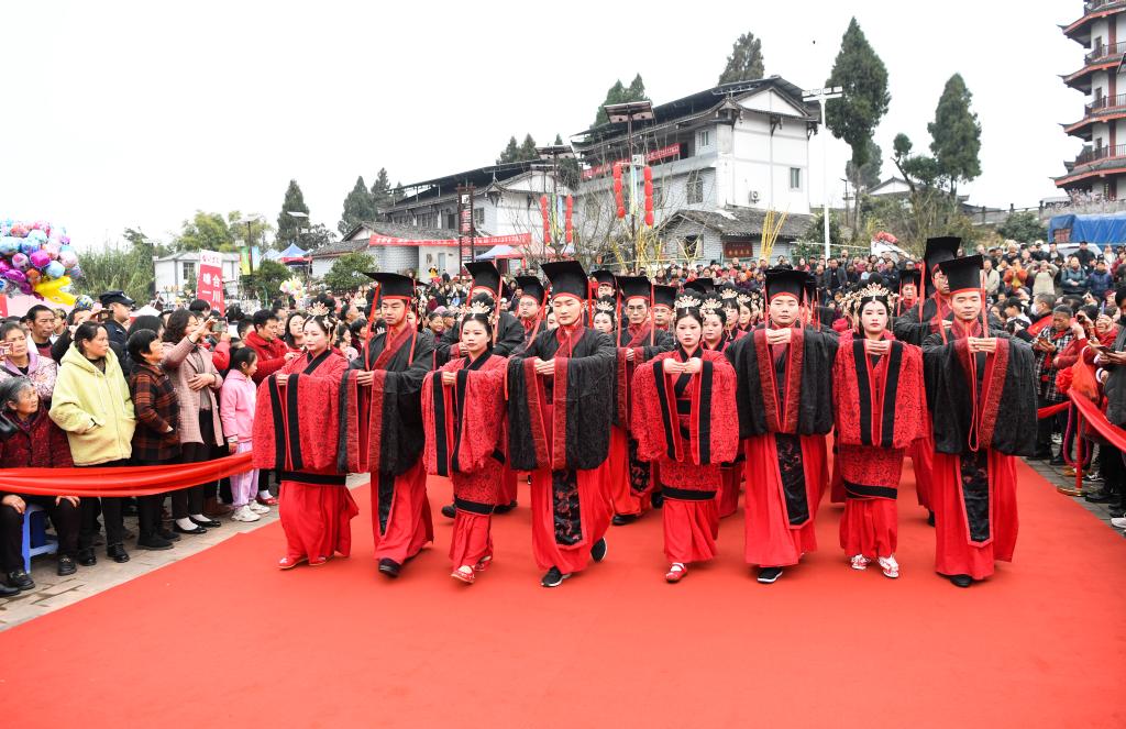 This photo taken on March 9, 2024 shows couples dressed in traditional costumes taking part in a group wedding in Tongnan District of Chongqing, southwest China. (Xinhua/Wang Quanchao)