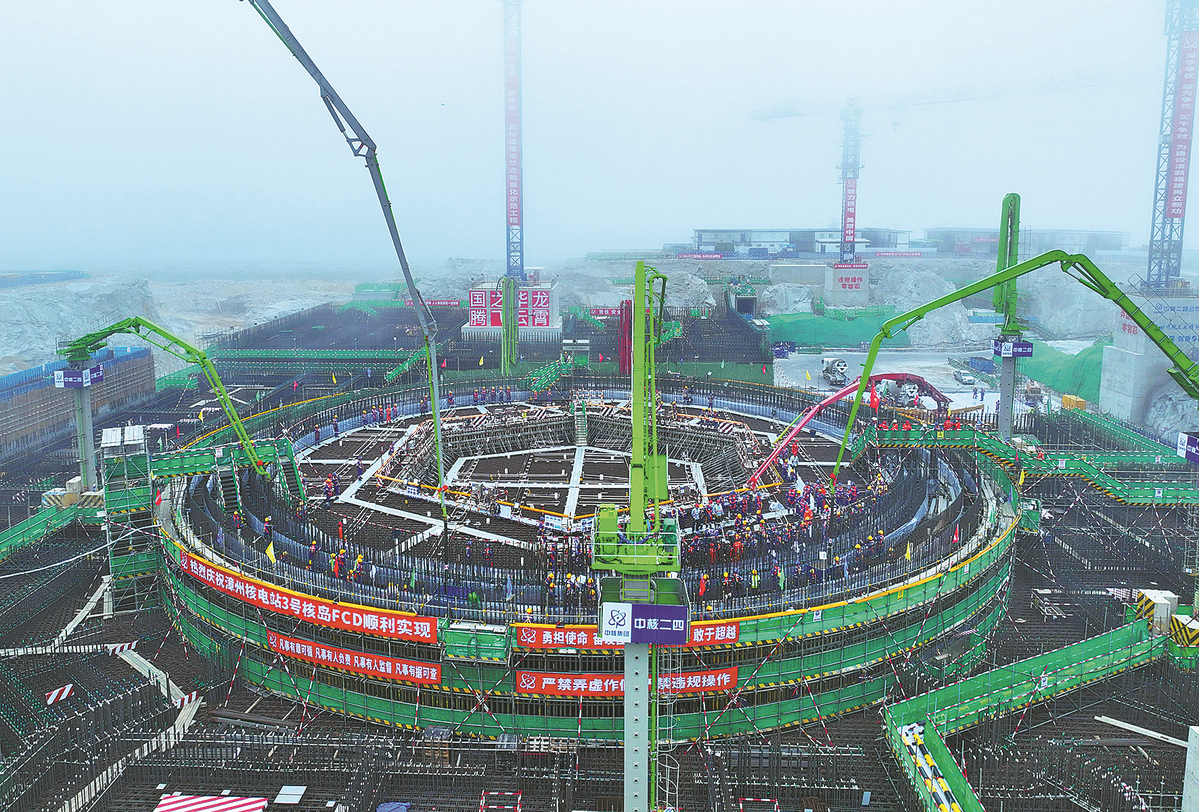 An aerial drone photo taken on Feb 22 shows construction on the second phase of the Zhangzhou nuclear power project in Zhangzhou, Fujian province. The project uses Hualong One reactors, which are third-generation reactors developed domestically. [PHOTO/XINHUA]