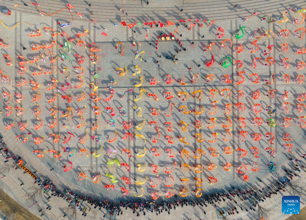 An aerial drone photo taken on March 11, 2024 shows people performing dragon dance in Jinan, east China's Shandong Province. (Photo by Xu Zhou/Xinhua)