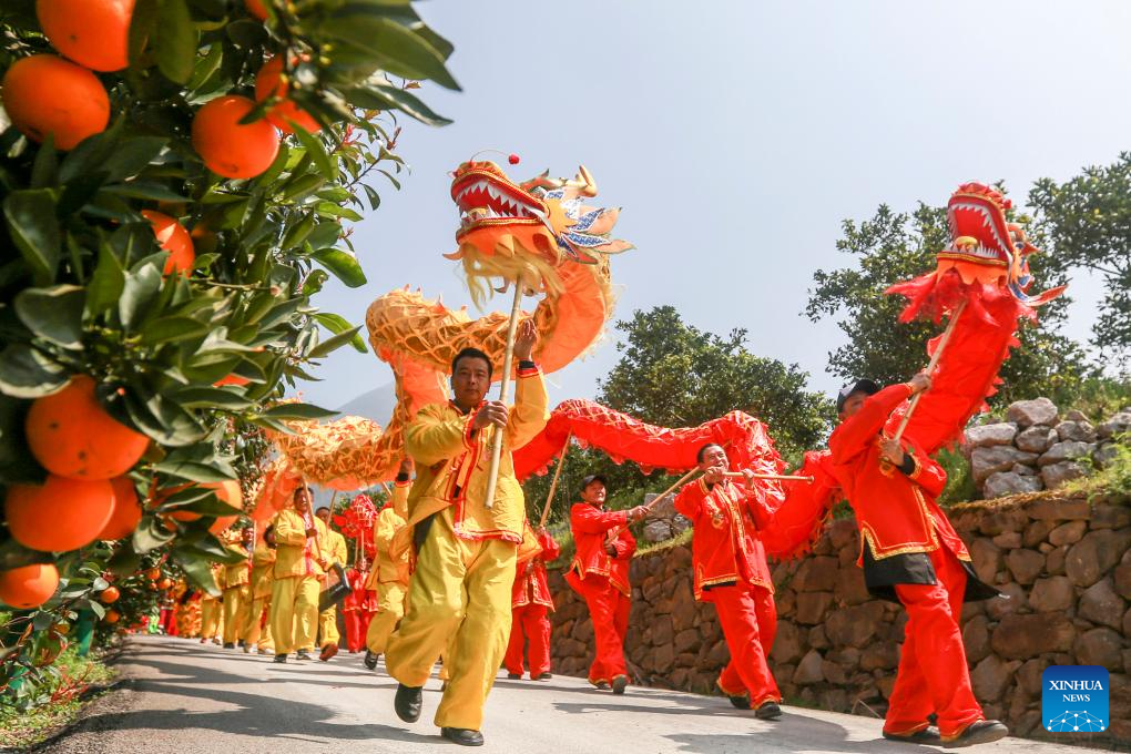 Villagers take part in a dragon dance parade in Wangusi Village of Zigui County, Yichang, central China's Hubei Province, March 11, 2024. (Photo by Wang Gang/Xinhua)