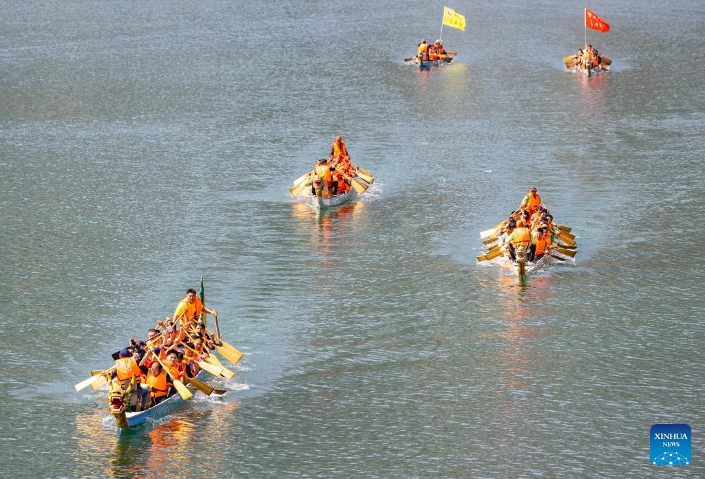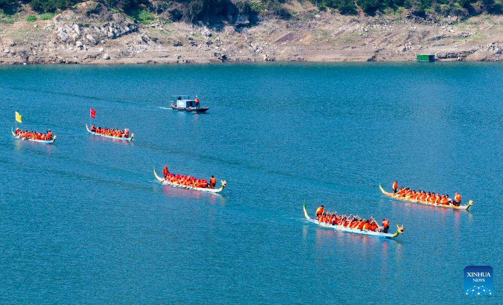 A drone photo taken on March 11, 2024 shows people taking part in a dragon boat race in Wangusi Village of Zigui County, Yichang, central China's Hubei Province. (Photo by Lei Yong/Xinhua)