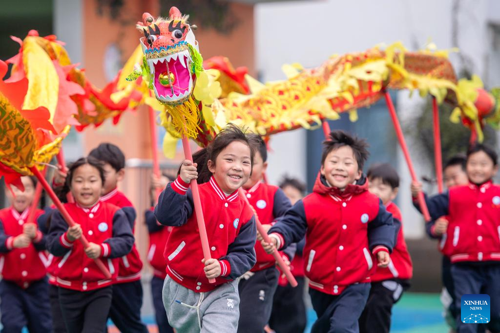 Children perform dragon dance at a kindergarten in Jiapu Town of Changxing County, Huzhou, east China's Zhejiang Province, March 11, 2024. (Photo by Tan Yunfeng/Xinhua)