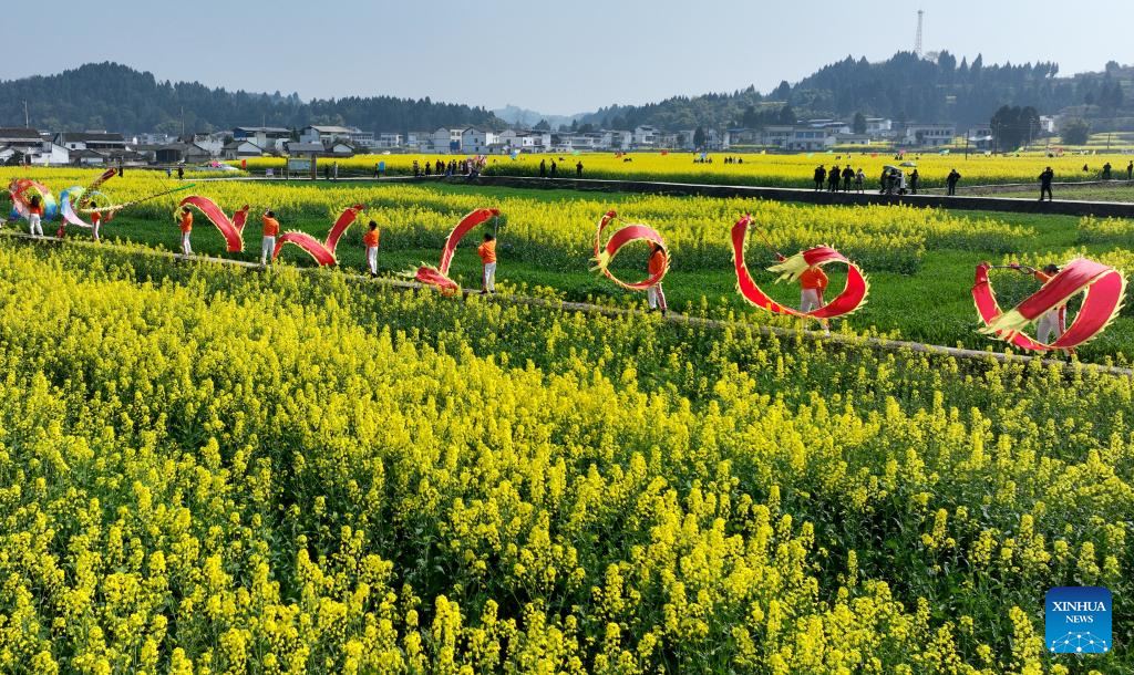 A drone photo taken on March 11, 2024 shows folk artists performing with ribbons in Wusheng Village of Pengan County, Nanchong, southwest China's Sichuan Province. (Photo by Liu Yonghong/Xinhua)