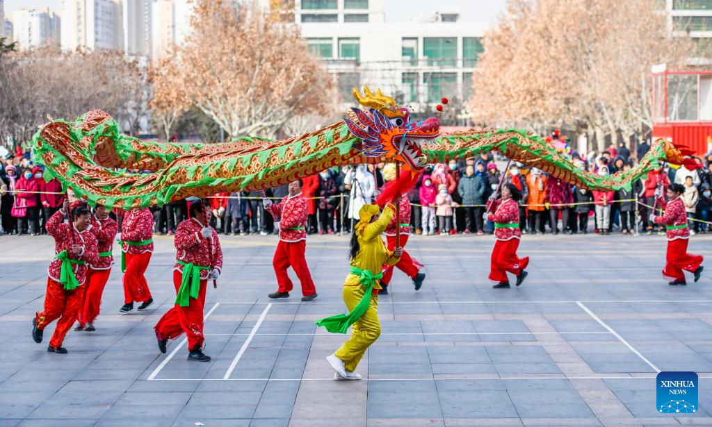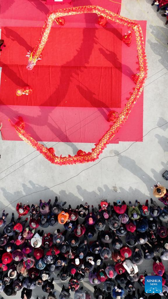 People perform dragon dance in Gaoqing County of Zibo, east China's Shandong Province, March 11, 2024. (Photo by Zhang Weitang/Xinhua)