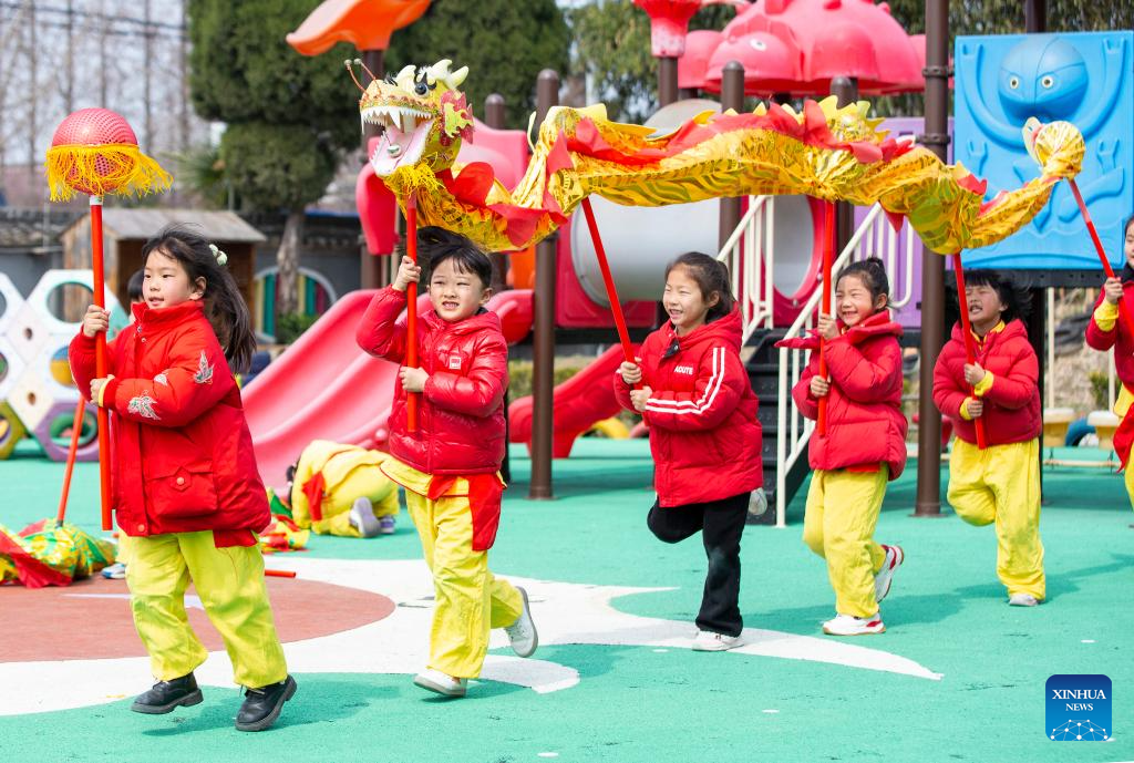 Children perform dragon dance at a kindergarten in Jimo District of Qingdao, east China's Shandong Province, March 11, 2024. (Photo by Liang Xiaopeng/Xinhua)