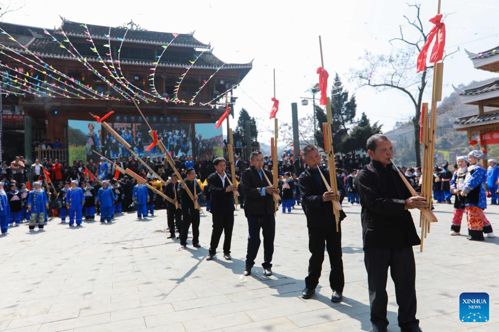 Folk artists perform Lusheng, a traditional musical instrument, to bless for harvest in Zhaitou Village of Sansui County, Qiandongnan Miao and Dong Autonomous Prefecture, southwest China's Guizhou Province, March 11, 2024. (Photo by Wan Wenjie/Xinhua)