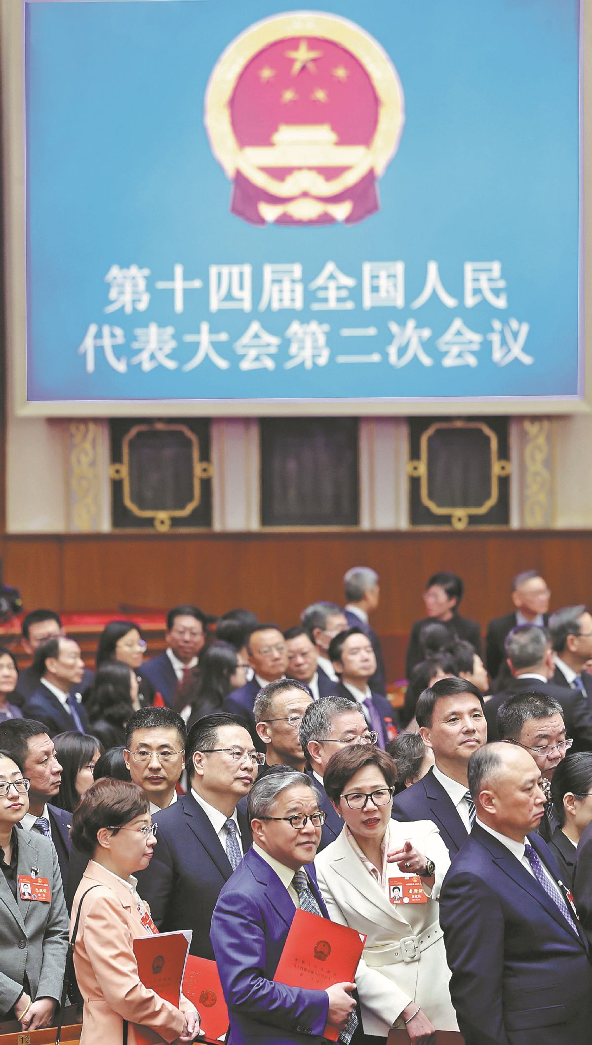 NPC deputies interact during the meeting at the Great Hall of the People. FENG YONGBIN/CHINA DAILY