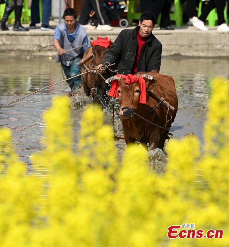 Farmers plow a field with cattle in Nanchong, southwest China's Sichuan Province, March 11, 2024. (Photo: China News Service/Liu Yonghong)