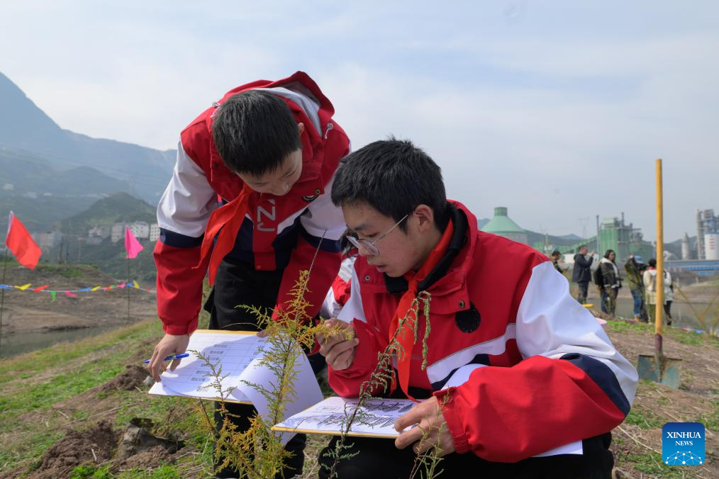 Students plant Myricaria laxiflora in Guojiaba Township of Zigui County, central China's Hubei Province, March 12, 2024.(Xinhua/Hu Jingwen)