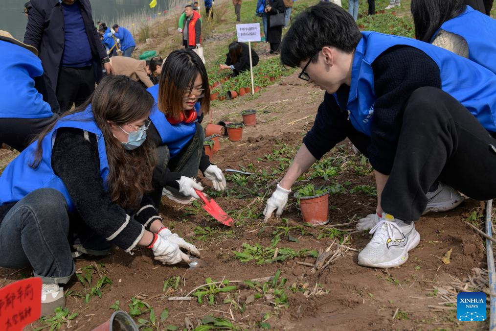 Volunteers plant Myricaria laxiflora in Guojiaba Township of Zigui County, central China's Hubei Province, March 12, 2024.(Xinhua/Hu Jingwen)