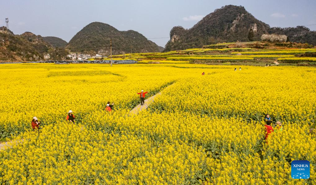 A drone photo shows tourists visiting cole flower fields in Wayao Village of Liuzhi Special District in Liupanshui, southwest China's Guizhou Province, March 12, 2024. (Xinhua/Tao Liang)