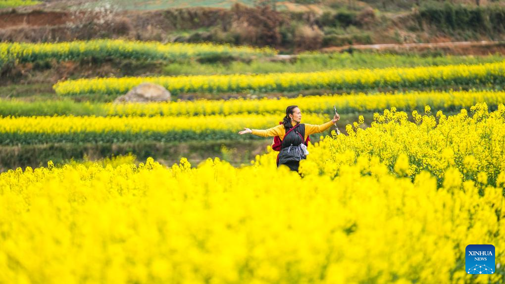 A tourist poses for photos in cole flower fields in Wayao Village of Liuzhi Special District in Liupanshui, southwest China's Guizhou Province, March 12, 2024. (Xinhua/Tao Liang)