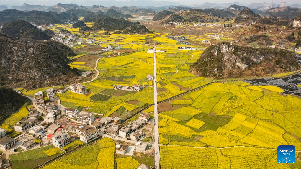 This aerial drone photo taken on March 12, 2024 shows cole flower fields in Dibo Village of Liuzhi Special District in Liupanshui, southwest China's Guizhou Province. (Xinhua/Tao Liang)