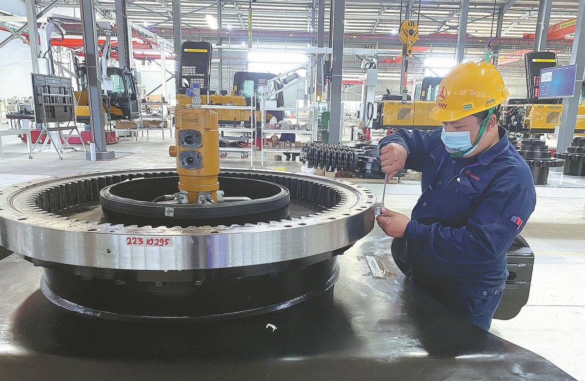 A worker assembles a component at Sany's lighthouse factory in Bekasi, Indonesia, in August 2023. [Photo/China Daily]