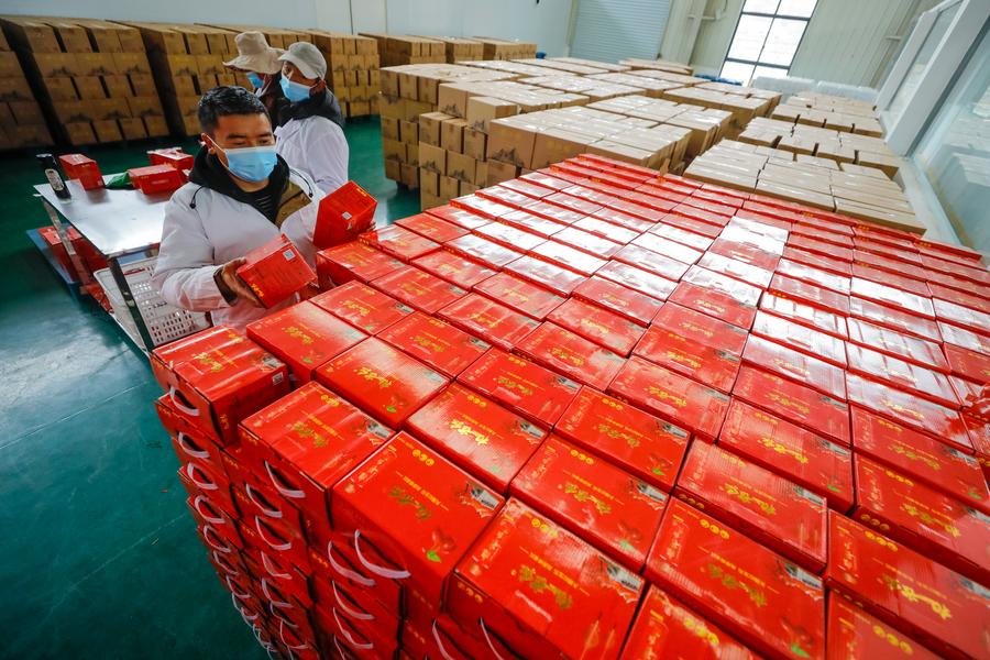 Workers arrange beverage products made from Cut-leaf Crabapple at a packaging workshop of a food company in Daofu County, southwest China's Sichuan Province, March 10, 2024. (Xinhua/Shen Bohan)