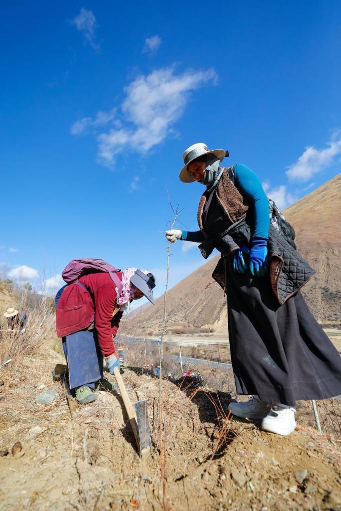 Villagers plant Cut-leaf Crabapple saplings in Daofu County, southwest China's Sichuan Province, March 10, 2024. (Xinhua/Shen Bohan)