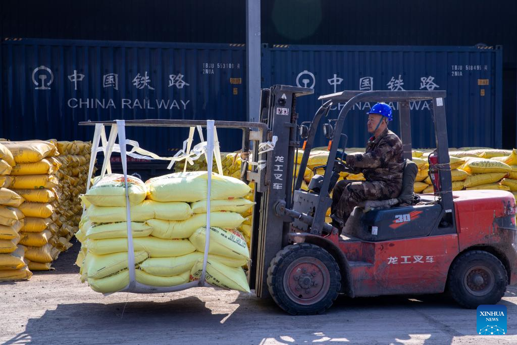 A worker carries chemical fertilizer at the freight yard of Zhaodong Station, Daqing depot of China Railway Harbin Bureau Group Co., Ltd., northeast China's Heilongjiang Province, March 13, 2024. As spring farming activities is about to start in Heilongjiang, a major grain producing province, China Railway Harbin Bureau Group Co., Ltd. has established a regular contact mechanism involving local fertilizer dealers, with more than 500,000 tonnes of fertilizer transported since the beginning of 2024. (Xinhua/Zhang Tao)