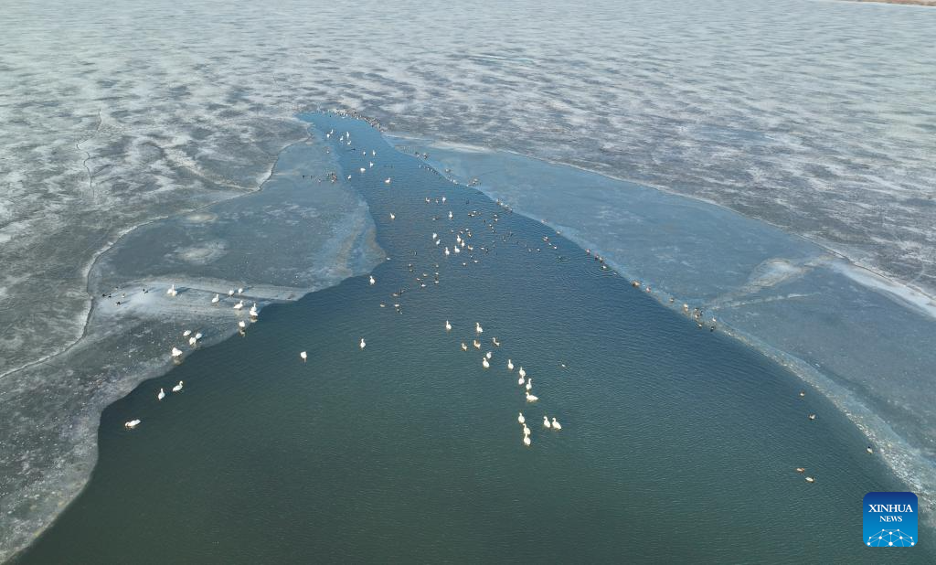 An aerial drone photo taken on March 13, 2024 shows migratory birds at the Wolong Lake wetland in Kangping County of Shenyang, capital of northeast China's Liaoning Province. (Xinhua/Long Lei)