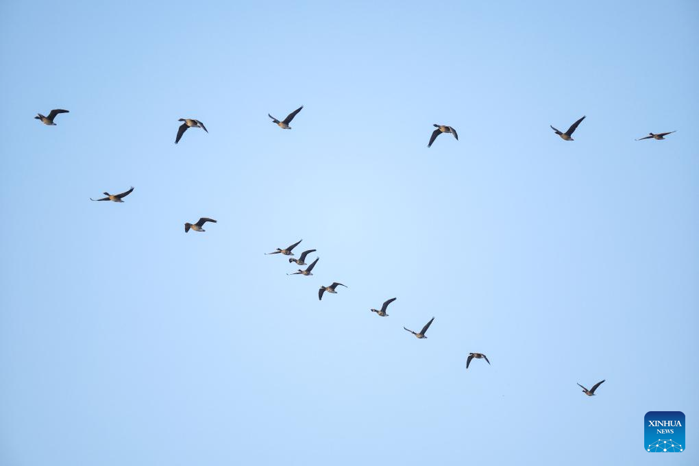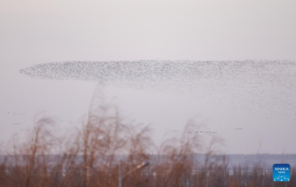 This photo taken on March 13, 2024 shows migratory birds at the Wolong Lake wetland in Kangping County of Shenyang, capital of northeast China's Liaoning Province. (Xinhua/Long Lei)