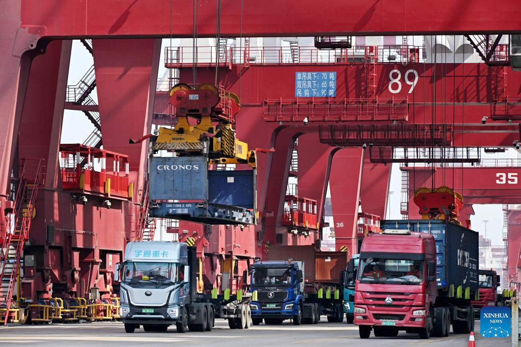 Trucks transport containers at Qingdao Port in east China's Shandong Province, March 13, 2024. The total import and export of goods in Qingdao grew 5.4 percent year on year to 125.8 billion yuan (about 17.49 billion U.S. dollars) in the first two months of 2024, according to the local customs administration. (Xinhua/Li Ziheng)