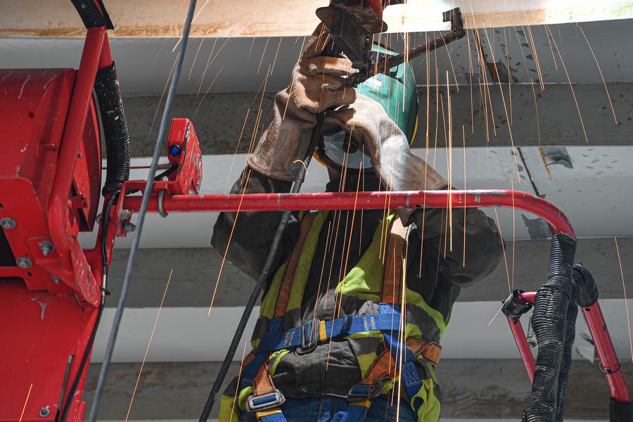 A worker works at the construction site of Hainan commercial spacecraft launch site in Wenchang, south China's Hainan Province, March 6, 2024. (Xinhua/Pu Xiaoxu)