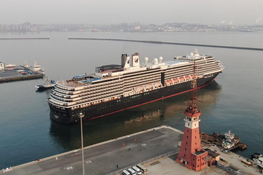 Tourists aboard the Zuiderdam cruise ship arrive at Dalian port in Dalian, northeast China's Liaoning Province, March 10, 2024. (Xinhua/Pan Yulong)