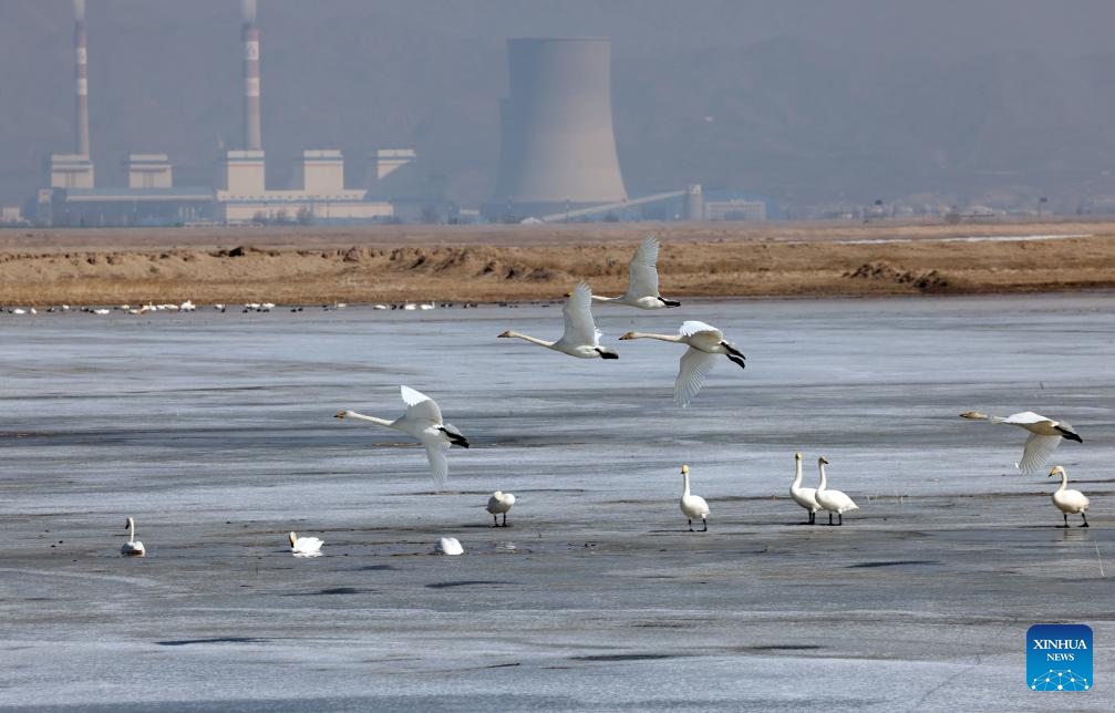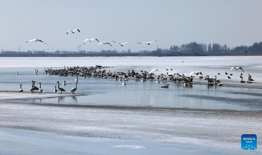 Swans are seen at a Yellow River shoal at the foot of Yinshan Mountain in north China's Inner Mongolia Autonomous Region, March 13, 2024. (Xinhua/Jia Lijun)