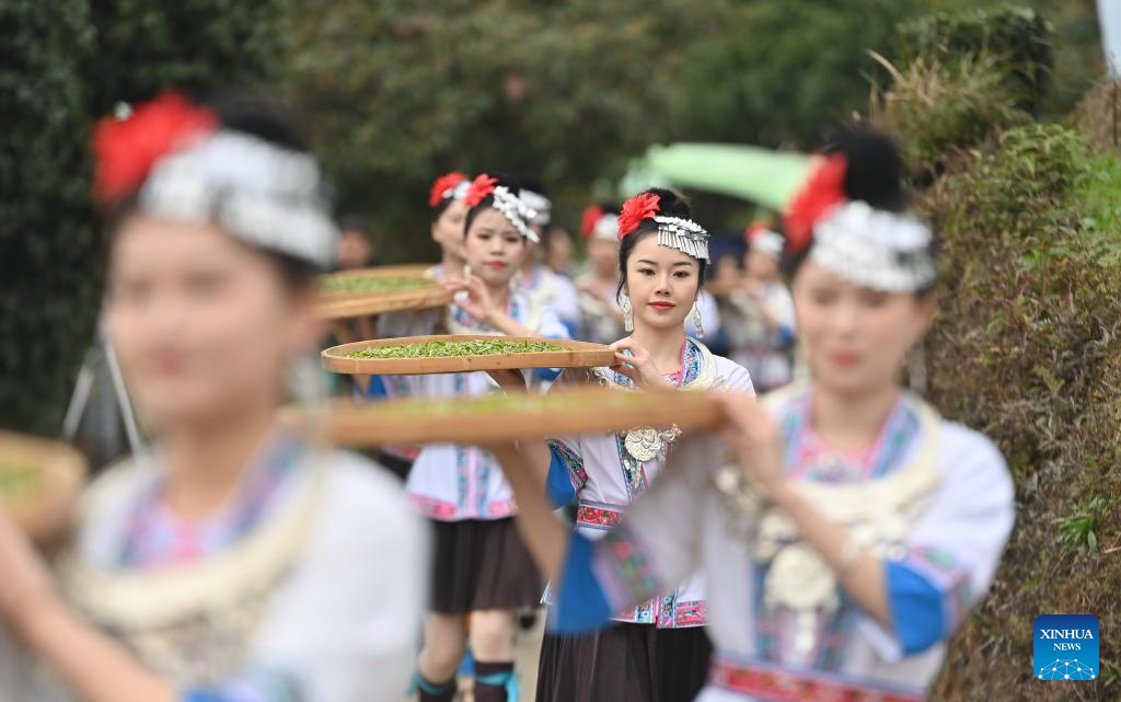 Girls of Dong ethnic group display newly-picked tea leaves in Buyang Village of Bajiang Township in Sanjiang Dong Autonomous County, south China's Guangxi Zhuang Autonomous Region, March 14, 2024. A two-day event promoting the tea culture kicked off in Sanjiang on Thursday. A series of activities, such as a ceremony marking the start of spring tea picking, tea art display, contracts signing, and technical exchange, are held to promote the high-quality development of local tea industry. (Xinhua/Huang Xiaobang)