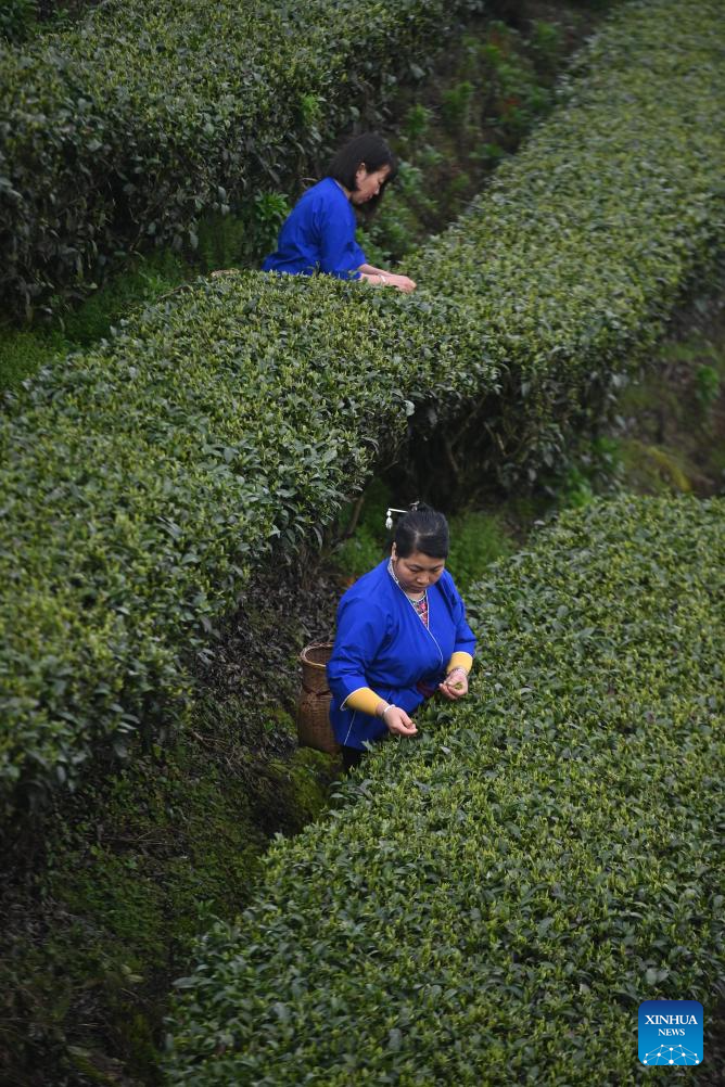 Villagers pick tea leaves in Buyang Village of Bajiang Township in Sanjiang Dong Autonomous County, south China's Guangxi Zhuang Autonomous Region, March 14, 2024. A two-day event promoting the tea culture kicked off in Sanjiang on Thursday. A series of activities, such as a ceremony marking the start of spring tea picking, tea art display, contracts signing, and technical exchange, are held to promote the high-quality development of local tea industry. (Xinhua/Huang Xiaobang)
