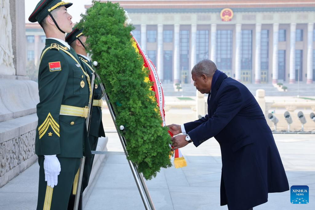 Angolan President lays wreath at Monument to People's Heroes in Beijing