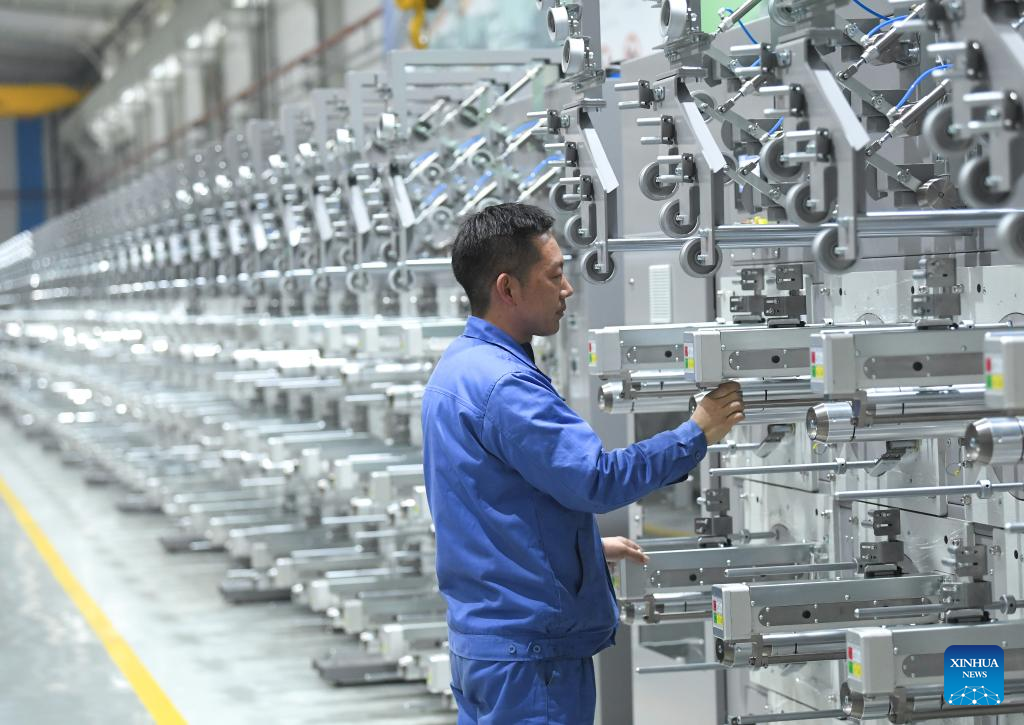 A technician makes adjustments on an in-house developed machine at a company in Keqiao District of Shaoxing, east China's Zhejiang Province, March 14, 2024. Keqiao District of Shaoxing is a cluster base for the textile industry, housing more than 8,000 textile businesses with an output value of over 100 billion yuan(about 13.9 billion U.S. dollars). In recent years, the district has promoted transformation and upgrading, introducing environmentally friendly machinery and innovative technologies. The local traditional industry, initially labor-intensive, is making a switch to a low-pollution, high-tech, and high-value advanced manufacturing segment. (Xinhua/Weng Xinyang)
