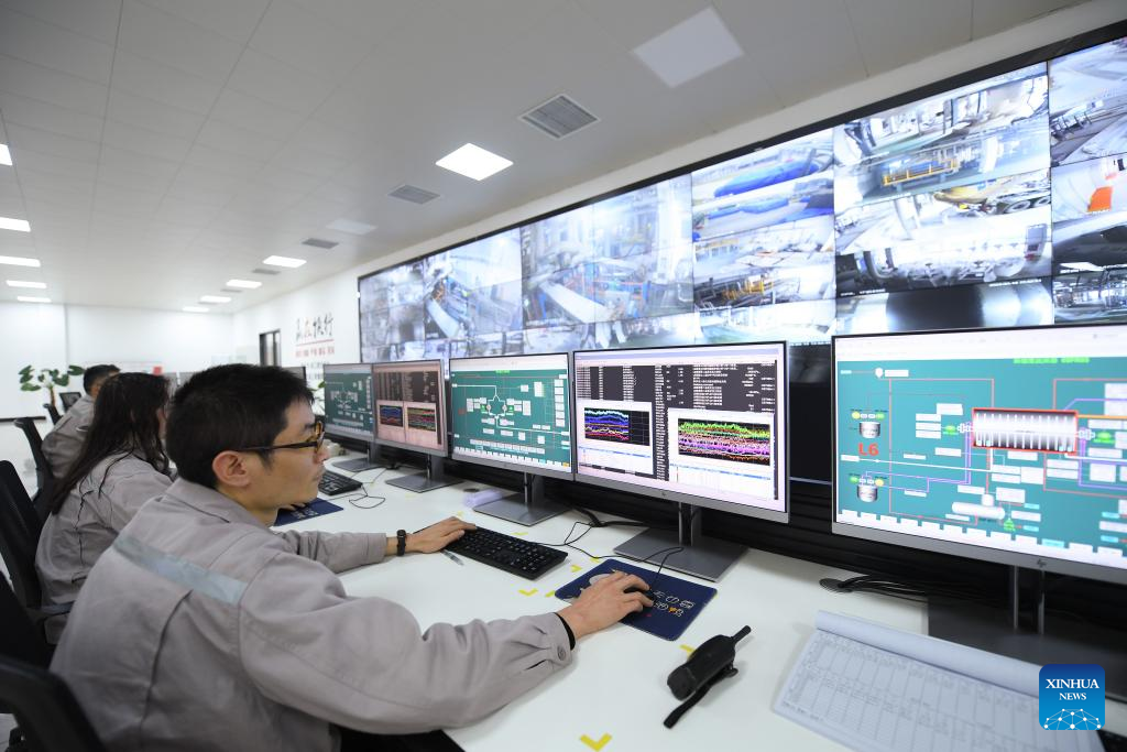 Workers operate the centralized control system at the control room of a company in Keqiao District of Shaoxing, east China's Zhejiang Province, March 14, 2024. Keqiao District of Shaoxing is a cluster base for the textile industry, housing more than 8,000 textile businesses with an output value of over 100 billion yuan(about 13.9 billion U.S. dollars). In recent years, the district has promoted transformation and upgrading, introducing environmentally friendly machinery and innovative technologies. The local traditional industry, initially labor-intensive, is making a switch to a low-pollution, high-tech, and high-value advanced manufacturing segment. (Xinhua/Weng Xinyang)