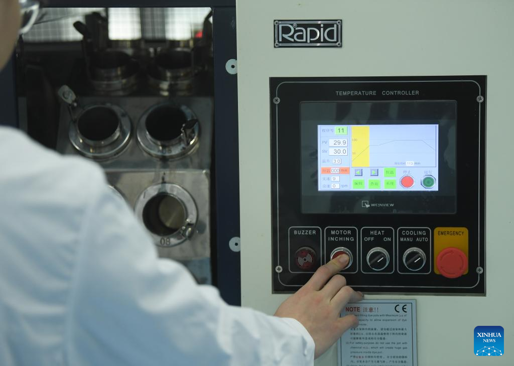 A researcher conducts experiments at a company in Keqiao District of Shaoxing, east China's Zhejiang Province, March 14, 2024. Keqiao District of Shaoxing is a cluster base for the textile industry, housing more than 8,000 textile businesses with an output value of over 100 billion yuan(about 13.9 billion U.S. dollars). In recent years, the district has promoted transformation and upgrading, introducing environmentally friendly machinery and innovative technologies. The local traditional industry, initially labor-intensive, is making a switch to a low-pollution, high-tech, and high-value advanced manufacturing segment. (Xinhua/Weng Xinyang)