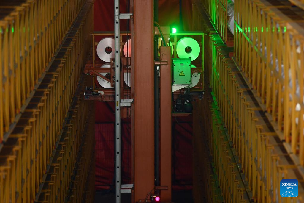 Robots deposit fiber products into a three-dimensional warehouse at a company in Keqiao District of Shaoxing, east China's Zhejiang Province, March 14, 2024. Keqiao District of Shaoxing is a cluster base for the textile industry, housing more than 8,000 textile businesses with an output value of over 100 billion yuan(about 13.9 billion U.S. dollars). In recent years, the district has promoted transformation and upgrading, introducing environmentally friendly machinery and innovative technologies. The local traditional industry, initially labor-intensive, is making a switch to a low-pollution, high-tech, and high-value advanced manufacturing segment. (Xinhua/Weng Xinyang)