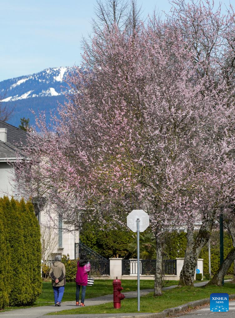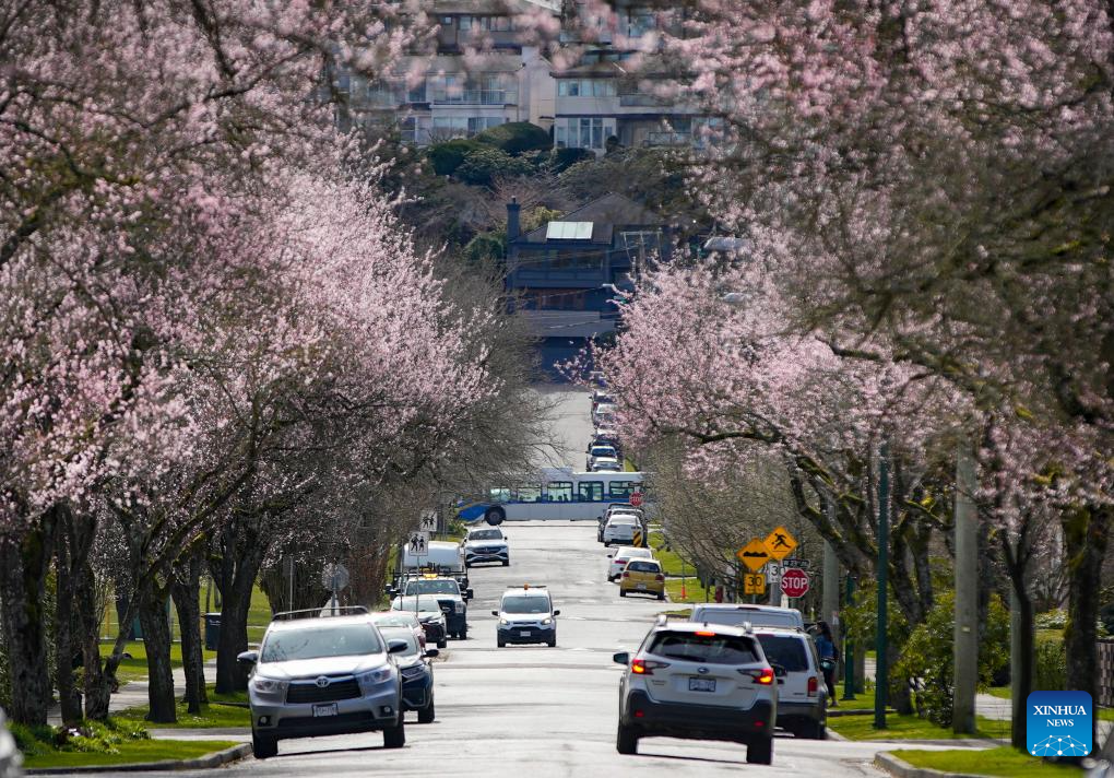 Blooming cherry trees are seen along a street in Vancouver, British Columbia, Canada, on March 15, 2024. (Photo by Liang Sen/Xinhua)