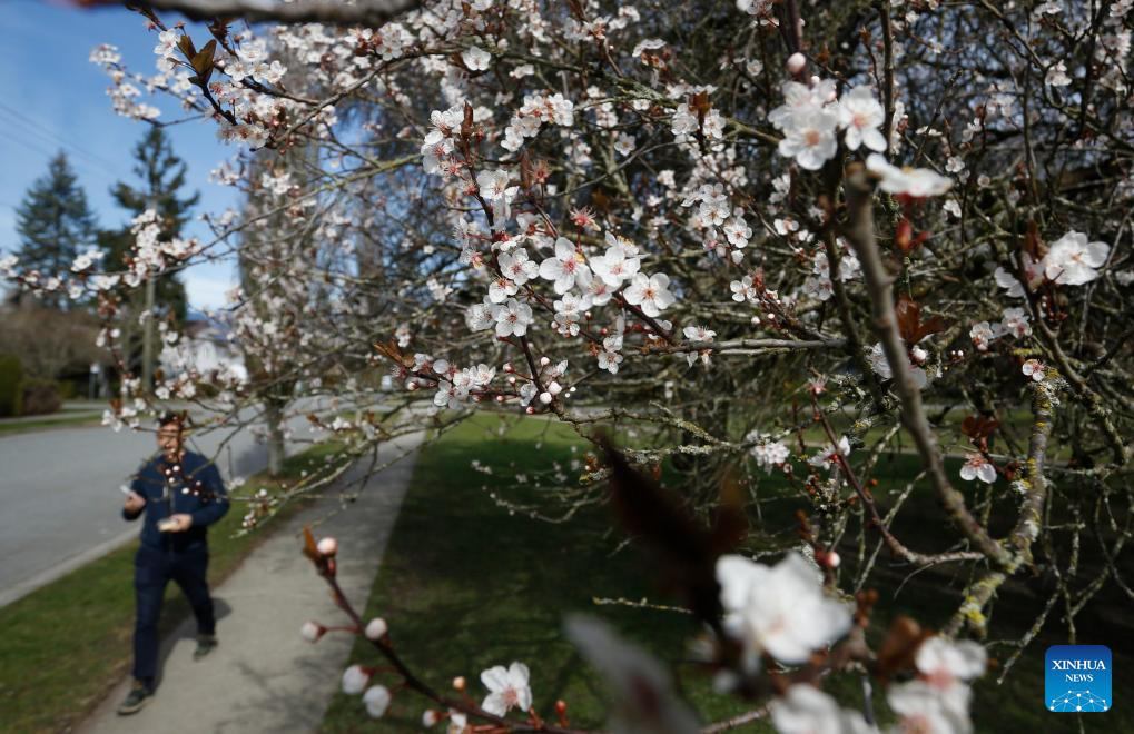 A resident walks past a blooming cherry tree along a sidewalk in Vancouver, British Columbia, Canada, on March 15, 2024. (Photo by Liang Sen/Xinhua)