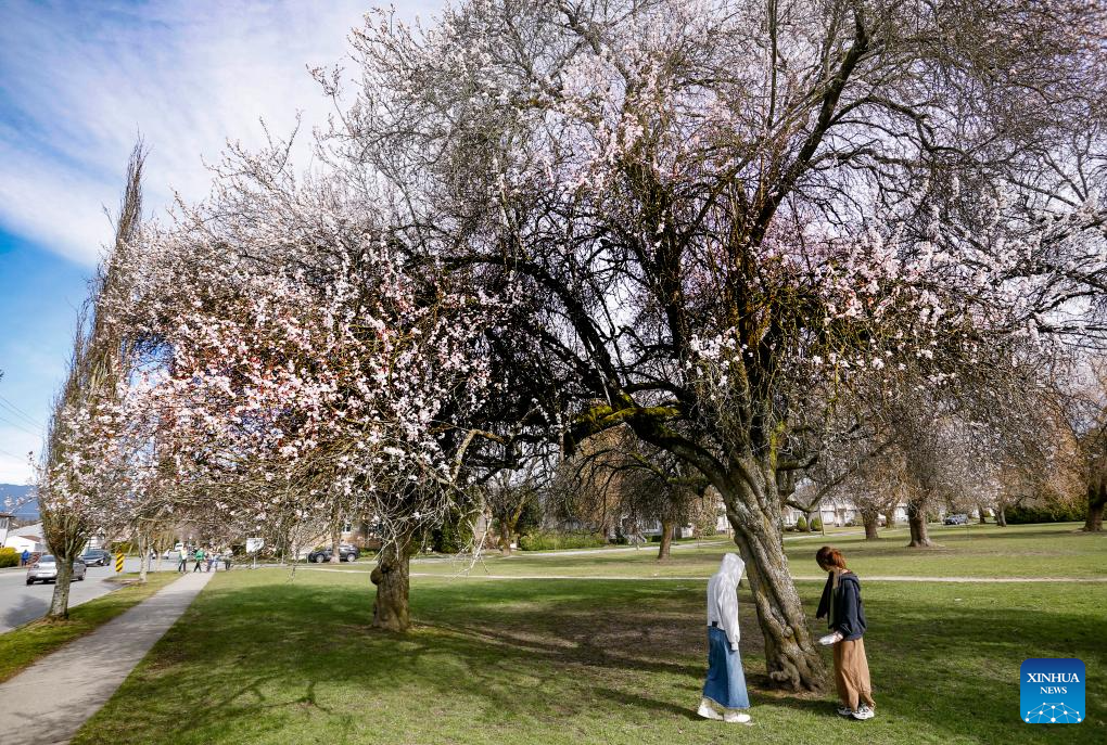 People enjoy cherry blossoms in Vancouver, British Columbia, Canada, on March 15, 2024. (Photo by Liang Sen/Xinhua)