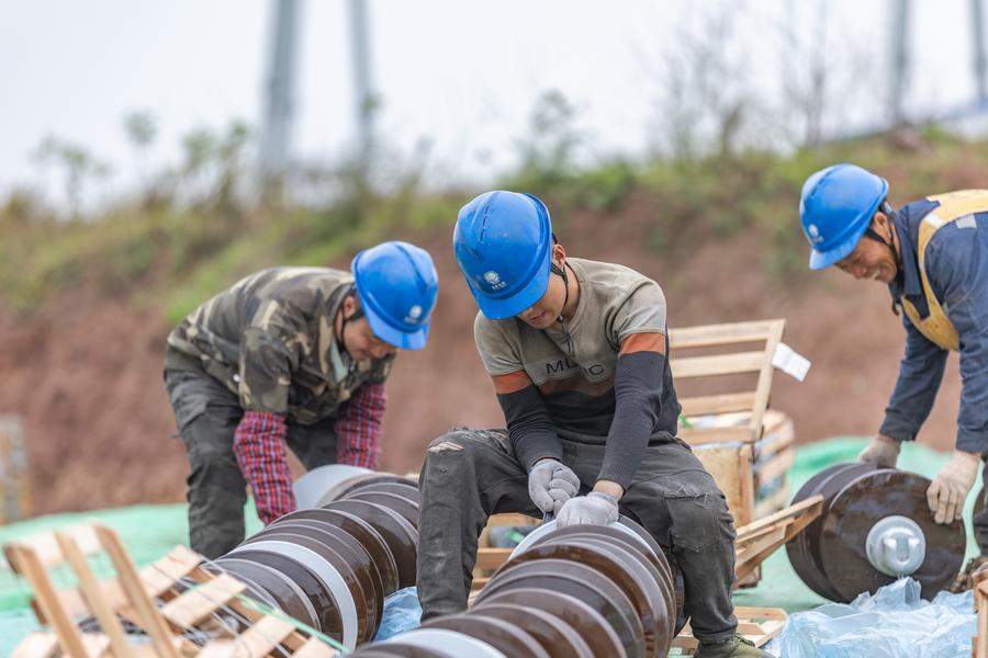 Workers install insulators at the construction site of the Sichuan-Chongqing 1,000kV UHV AC project in Shaoyun Town of Tongliang District, southwest China's Chongqing, March 17, 2024. (Xinhua/Huang Wei)