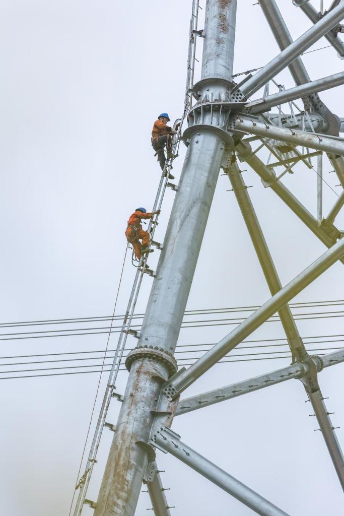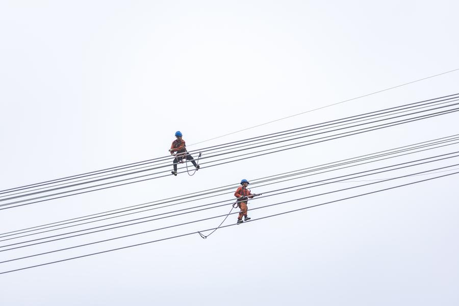 Technicians climb a transmission tower for work at the construction site of the Sichuan-Chongqing 1,000kV UHV AC project in Shaoyun Town of Tongliang District, southwest China's Chongqing, March 17, 2024. (Xinhua/Huang Wei)