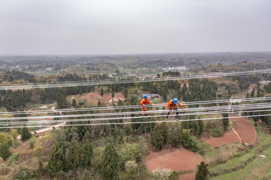 A drone photo taken on March 17, 2024 shows technicians working at the construction site of the Sichuan-Chongqing 1,000kV UHV AC project in Shaoyun Town of Tongliang District, southwest China's Chongqing. (Xinhua/Huang Wei)