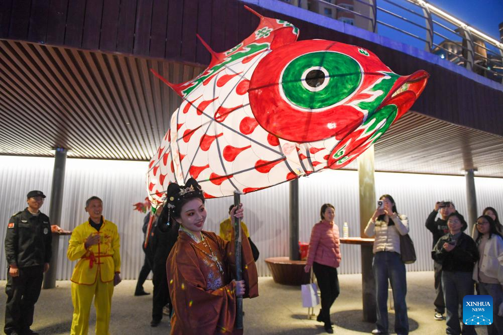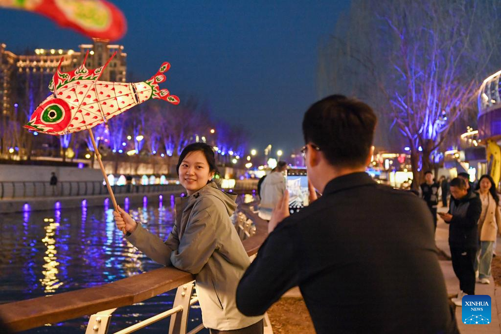 Tourists take photos of a fish-shaped lantern at an event along the Liangma River in Beijing, capital of China, March 16, 2024. A promotion event of the Liangma River was held on Saturday in Beijing. (Xinhua/Ju Huanzong)