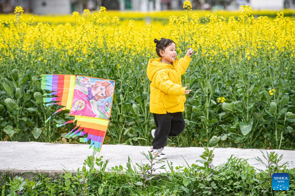 A girl flies a kite amid blooming yellow canola flowers in Changsheng Town of Pengshui Miao and Tujia Autonomous County, southwest China's Chongqing, March 16, 2024. Changsheng Town has made efforts to inject new vitality into rural revitalization in recent years. The town has built a demonstration base where farmers cultivate paddy rice and cole in rotation, and held a variety of agritourism activities to improve farmers' incomes. (Xinhua/Tang Yi)