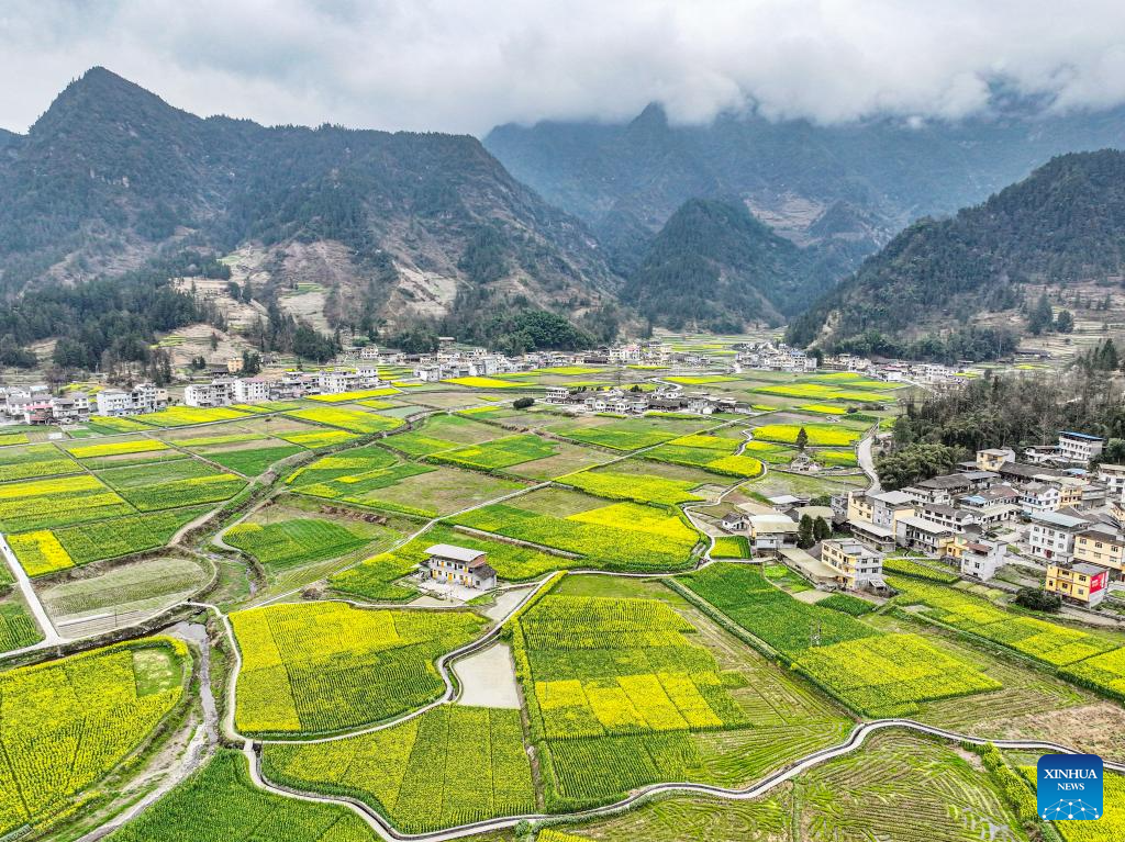An aerial drone photo taken on March 16, 2024 shows fields of yellow canola flowers in Changsheng Town of Pengshui Miao and Tujia Autonomous County, southwest China's Chongqing. Changsheng Town has made efforts to inject new vitality into rural revitalization in recent years. The town has built a demonstration base where farmers cultivate paddy rice and cole in rotation, and held a variety of agritourism activities to improve farmers' incomes. (Xinhua/Tang Yi)