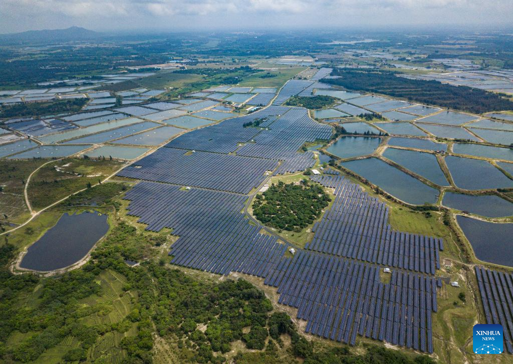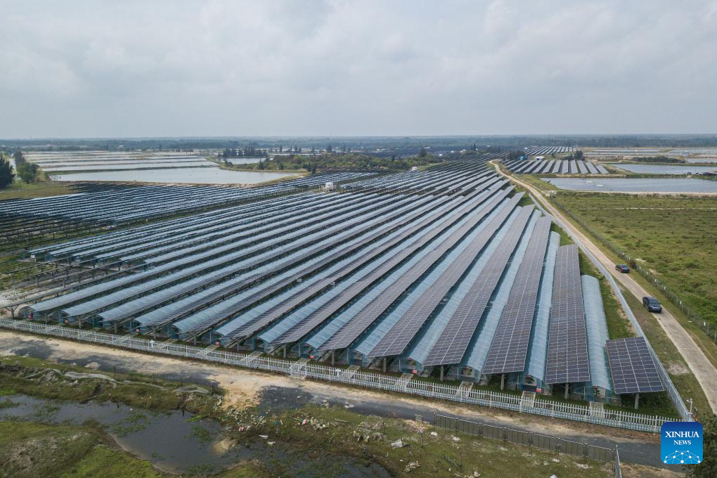 An aerial drone photo taken on March 15, 2024 shows a photovoltaic power station at Wangtangnan Village of Wengtian Town in Wenchang City, south China's Hainan Province. (Xinhua/Pu Xiaoxu)
