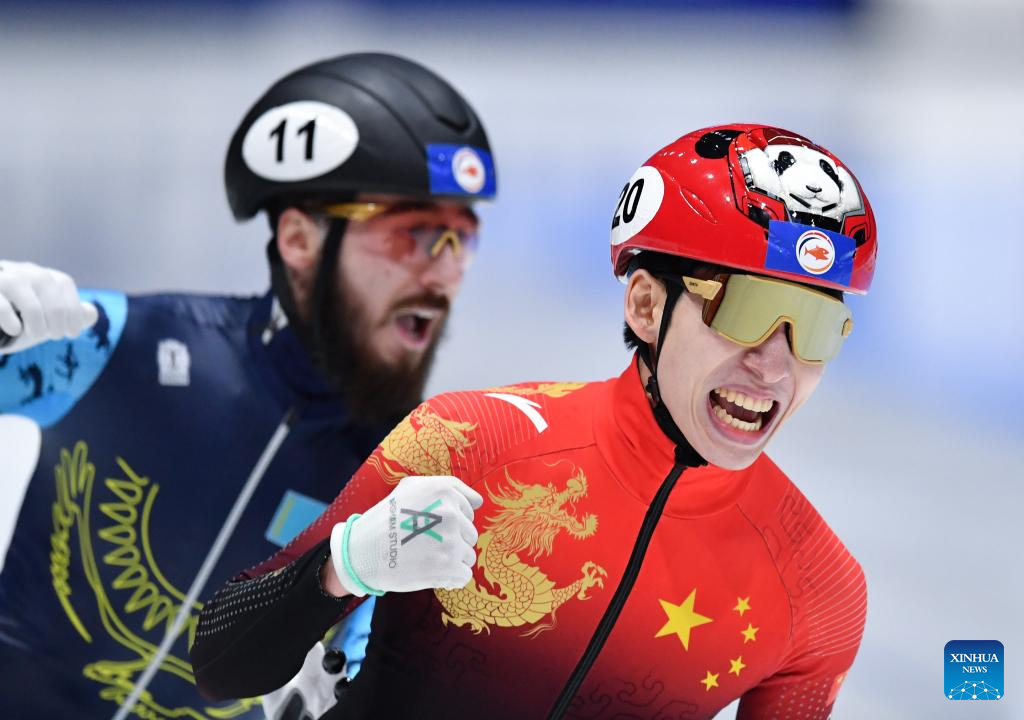 Lin Xiaojun of China celebrates after winning the men's 500m Final A at the ISU World Short Track Speed Skating Championships 2024 in Rotterdam, the Netherlands, March 16, 2024. (Xinhua/Lian Yi)