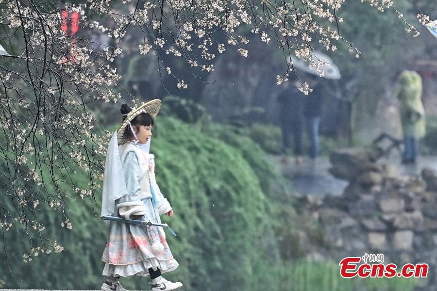 A girl in Hanfu (a traditional Chinese costume) walks under cherry blossoms at the Wangyue park in Changsha, central China's Hunan Province, March 17, 2024. (Photo: China News Service/Yang Huafeng)