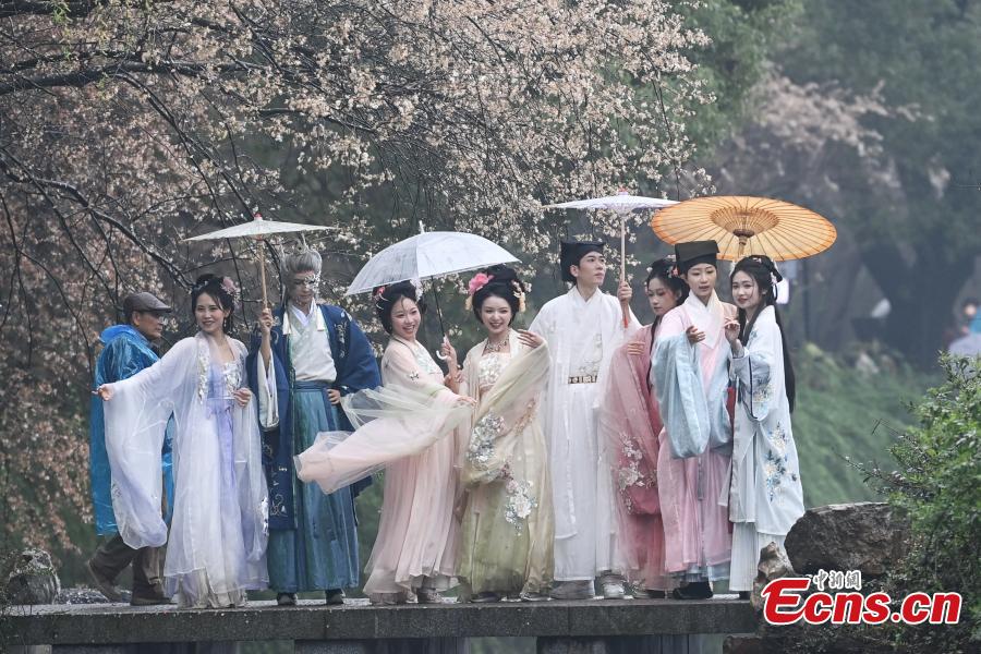 Visitors in Hanfu (a traditional Chinese costume) pose for a photo amid cherry blossoms at the Wangyue park in Changsha, central China's Hunan Province, March 17, 2024. (Photo: China News Service/Yang Huafeng)