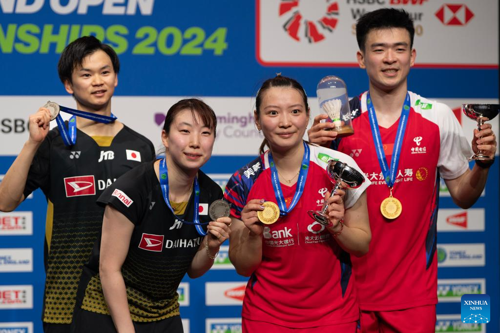 Zheng Siwei (1st R)/Huang Yaqiong (2nd R) of China and Watanabe Yuta (1st L)/Higashino Arisa of Japan pose on the podium after the mixed doubles final at All England Open Badminton Championships 2024 in Birmingham, Britain, March 17, 2024. (Xinhua)
