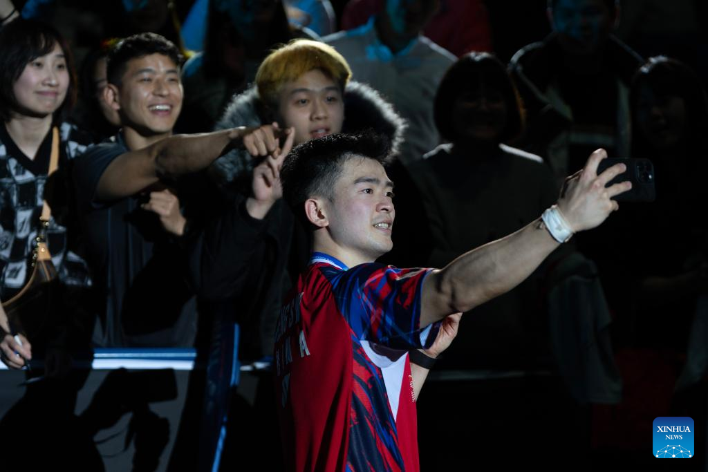 Zheng Siwei (front) of China takes selfies with fans after the mixed doubles final against Watanabe Yuta/Higashino Arisa of Japan at All England Open Badminton Championships 2024 in Birmingham, Britain, March 17, 2024. (Xinhua)
