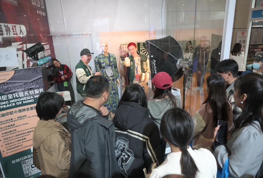 People watch Indonesian Internet influencers selling products via livestreaming at the 4th China Cross-border E-commerce Trade Fair in Fuzhou, southeast China's Fujian Province, March 18, 2024. (Xinhua/Lin Shanchuan)
